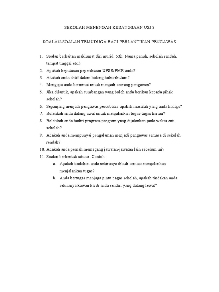 Soalan Dan Jawapan Temuduga Pengawas Sekolah Rendah Persoalan S