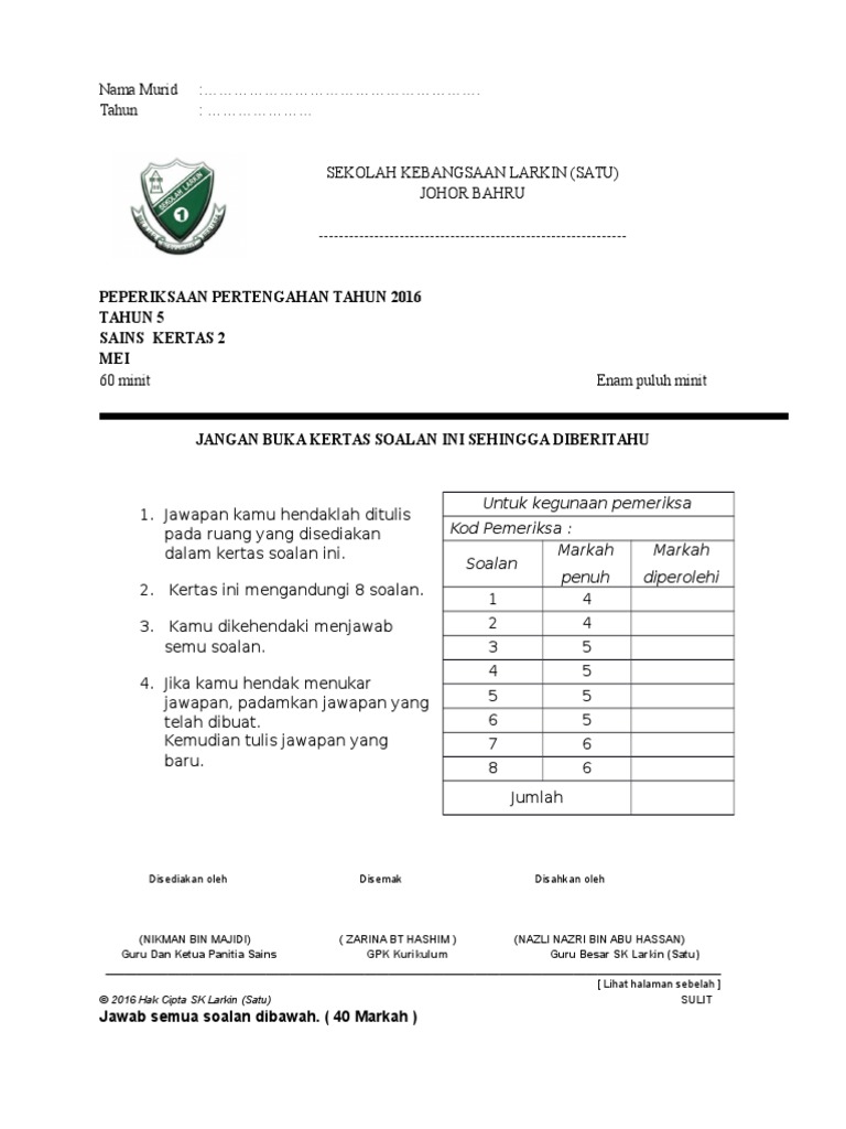 2016 Sains Tahun 5 Peperiksaan Pertengahan Tahun Kertas 2