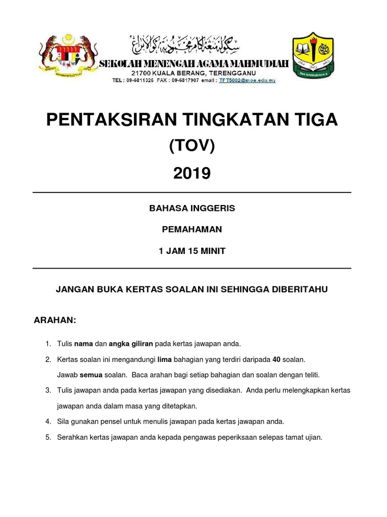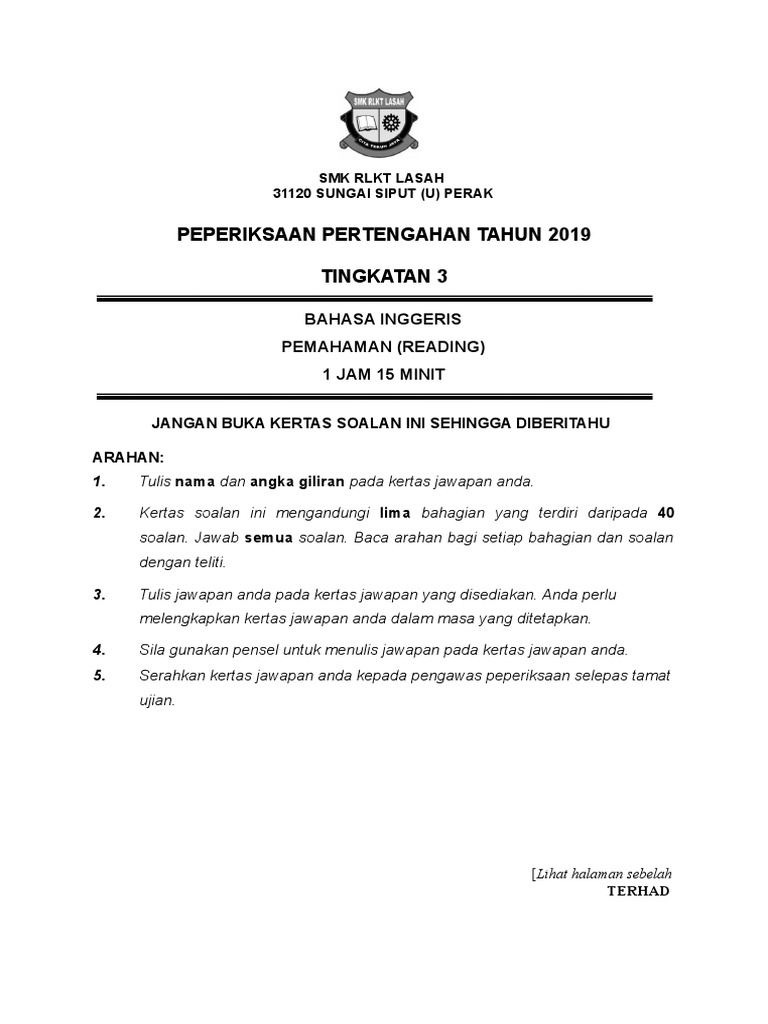 Pt3 Reading Sample Test Qp Pdf Terhad Instrumen Contoh Lembaga Peperiksaan Kementerian Pendidikan Malaysia H Pentaksiran Tingkatan Tiga Pemahaman N 1 Course Hero