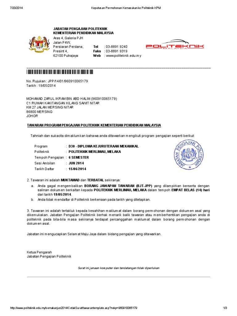 Print Surat Tawaran Kemasukan Ke Kolej Komuniti 940809035874 Pdf Document