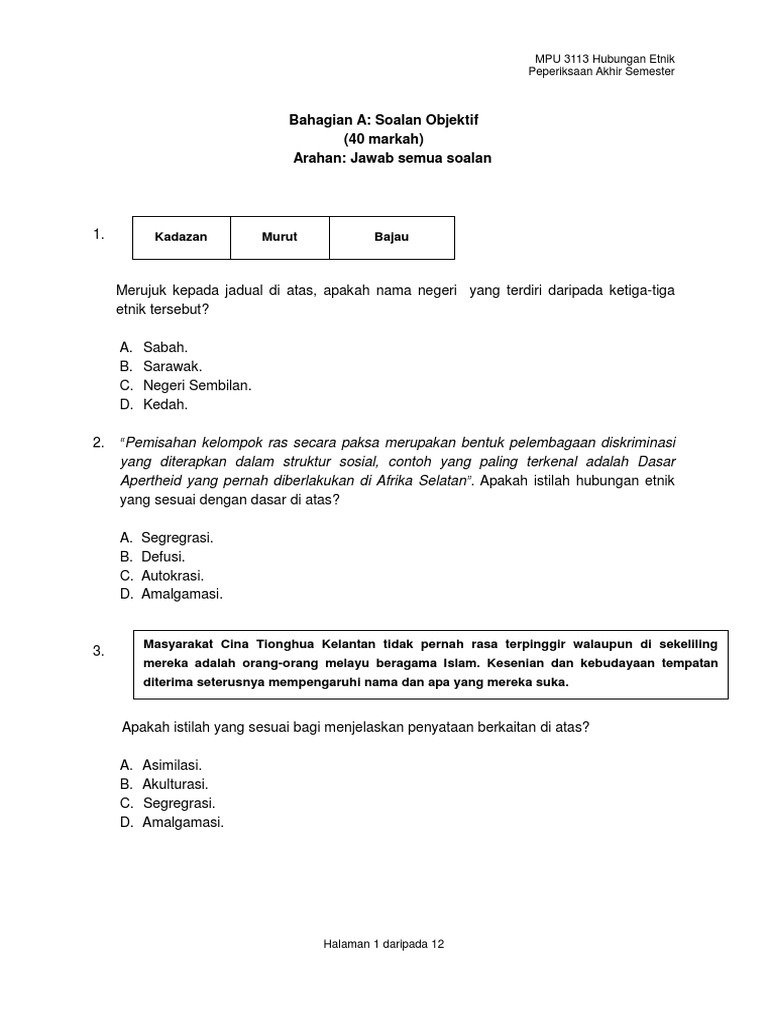 315219334 Contoh Soalan Hubungan Etnik Dan Jawapan Mpu 3113 Hubungan Etnik Peperiksaan Akhir Semester Bahagian A Soalan Objektif 40 Markah Arahan Course Hero
