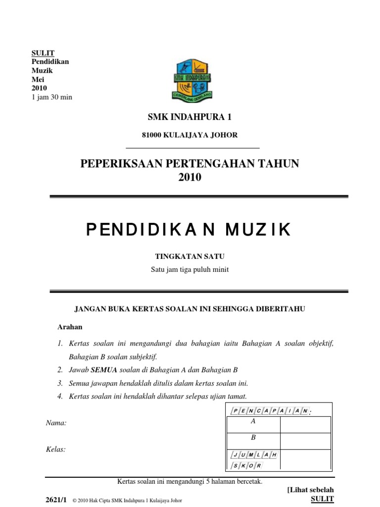 Pendidikan Muzik Tingkatan Satu Pep Pertengahan Tahun 2010