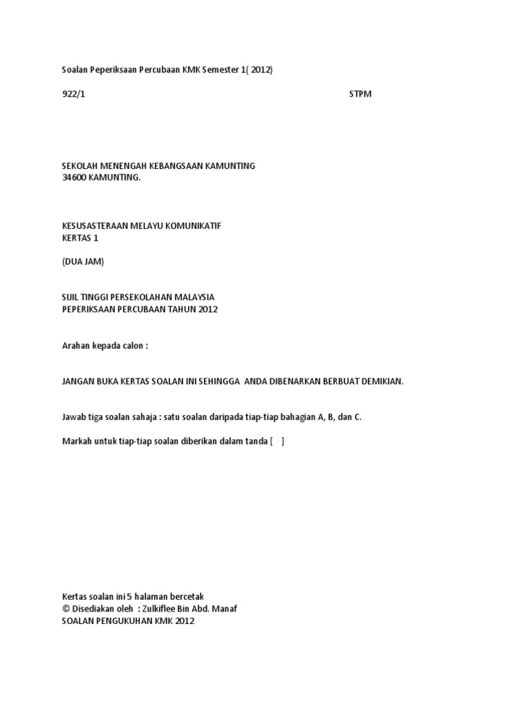 Tips Skor A Kesusasteraan Melayu Komunikatif Stpm Penggal 1 Docx