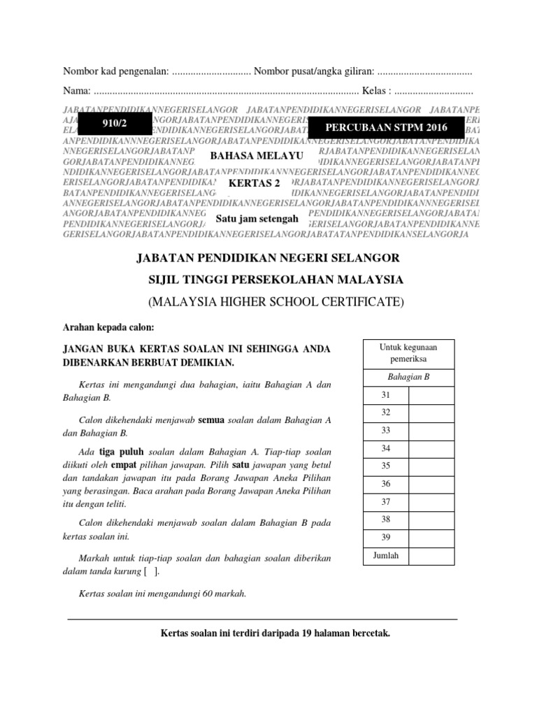 Percubaan Stpm Bm P2 2016 Selangor