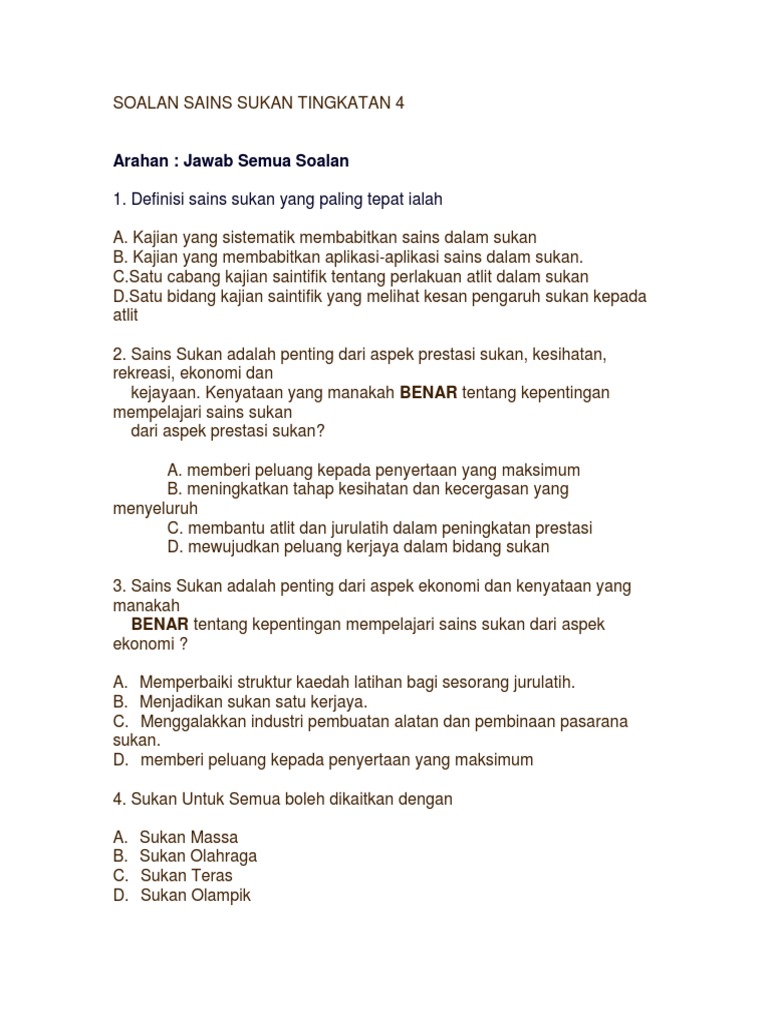 Soalan Dan Jawapan Sains Sukan Tingkatan 4